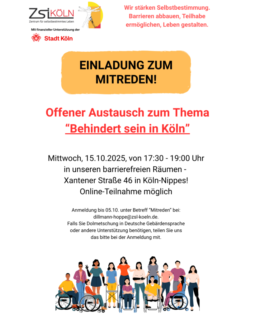 Anmeldung bis 05.10. unter Betreff “Mitreden” bei: dillmann-hoppe@zsl-koeln.de. Falls Sie Dolmetschung in Deutsche Gebärdensprache oder andere Unterstützung benötigen, teilen Sie uns das bitte bei der Anmeldung mit.